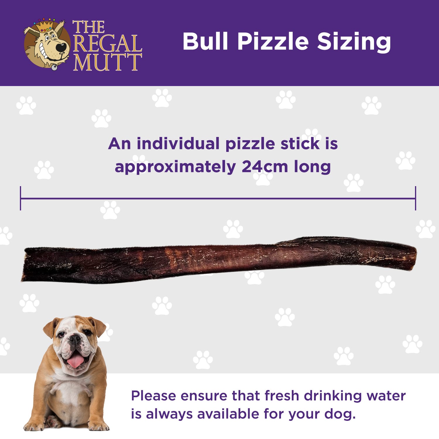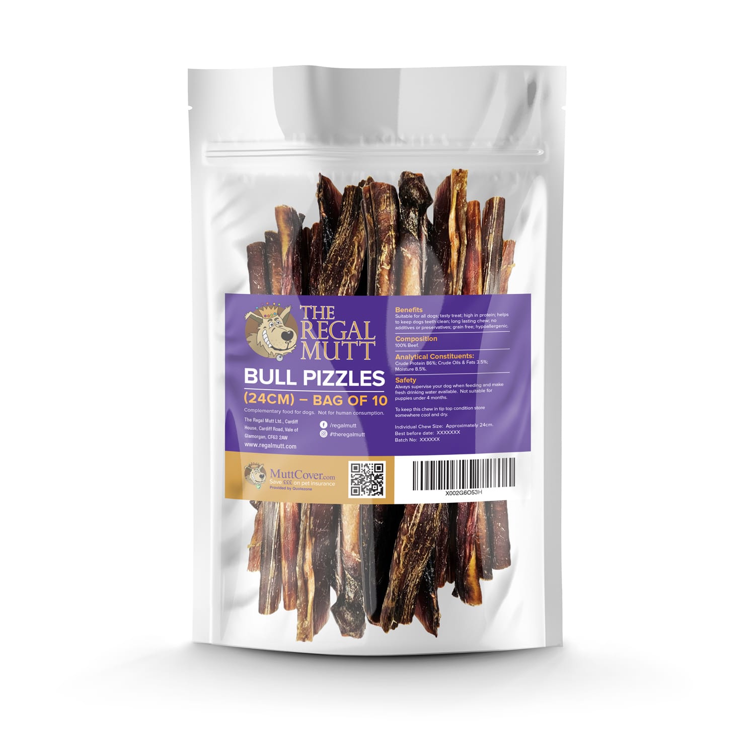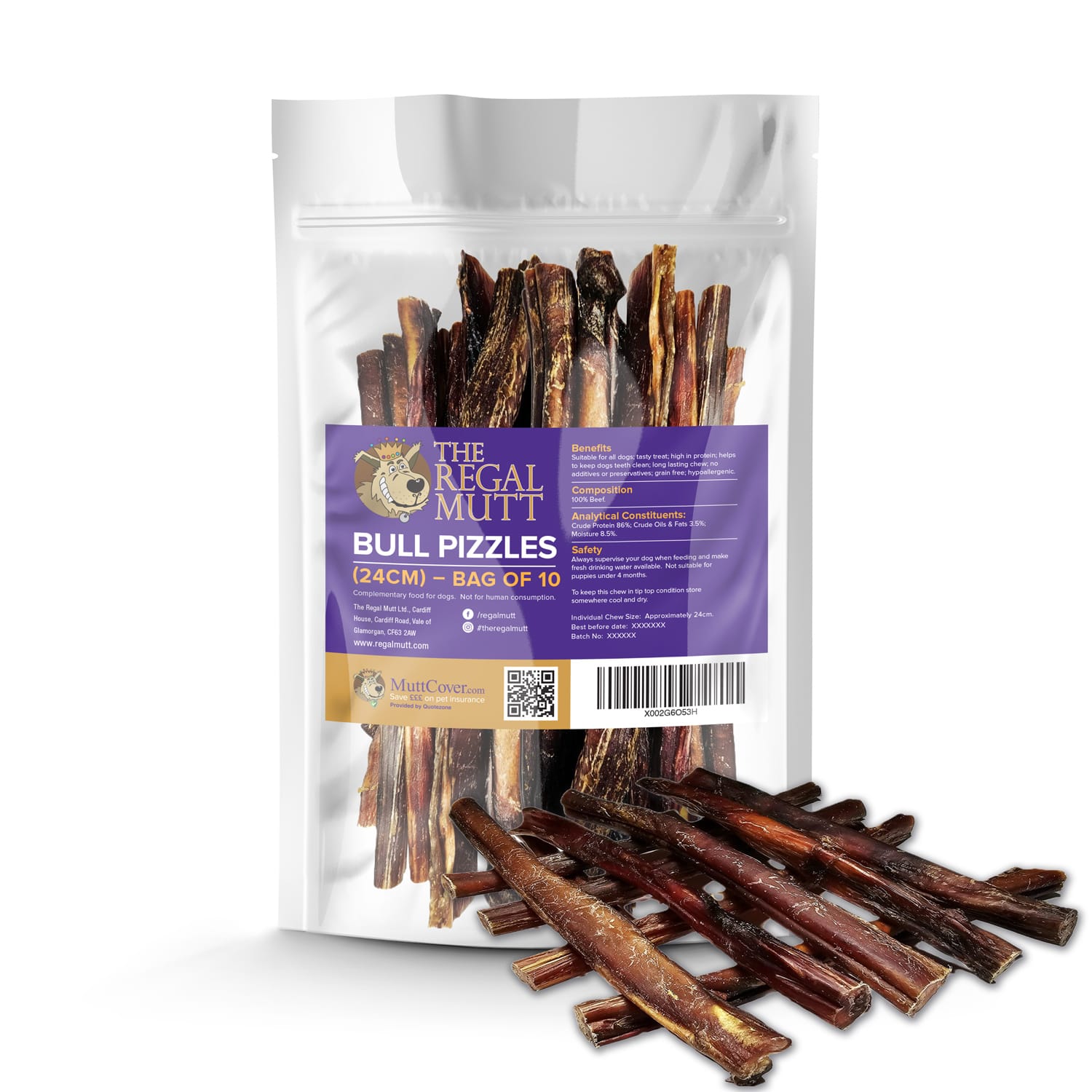 Description:  The Regal Mutt Bull Pizzles are 100% beef. Our tasty bully sticks are grain free, low in fat, high in protein and contain no artificial colours or flavours. They are a long lasting snack, and great for dogs that love a chew. Ideal for dogs with sensitive stomachs.