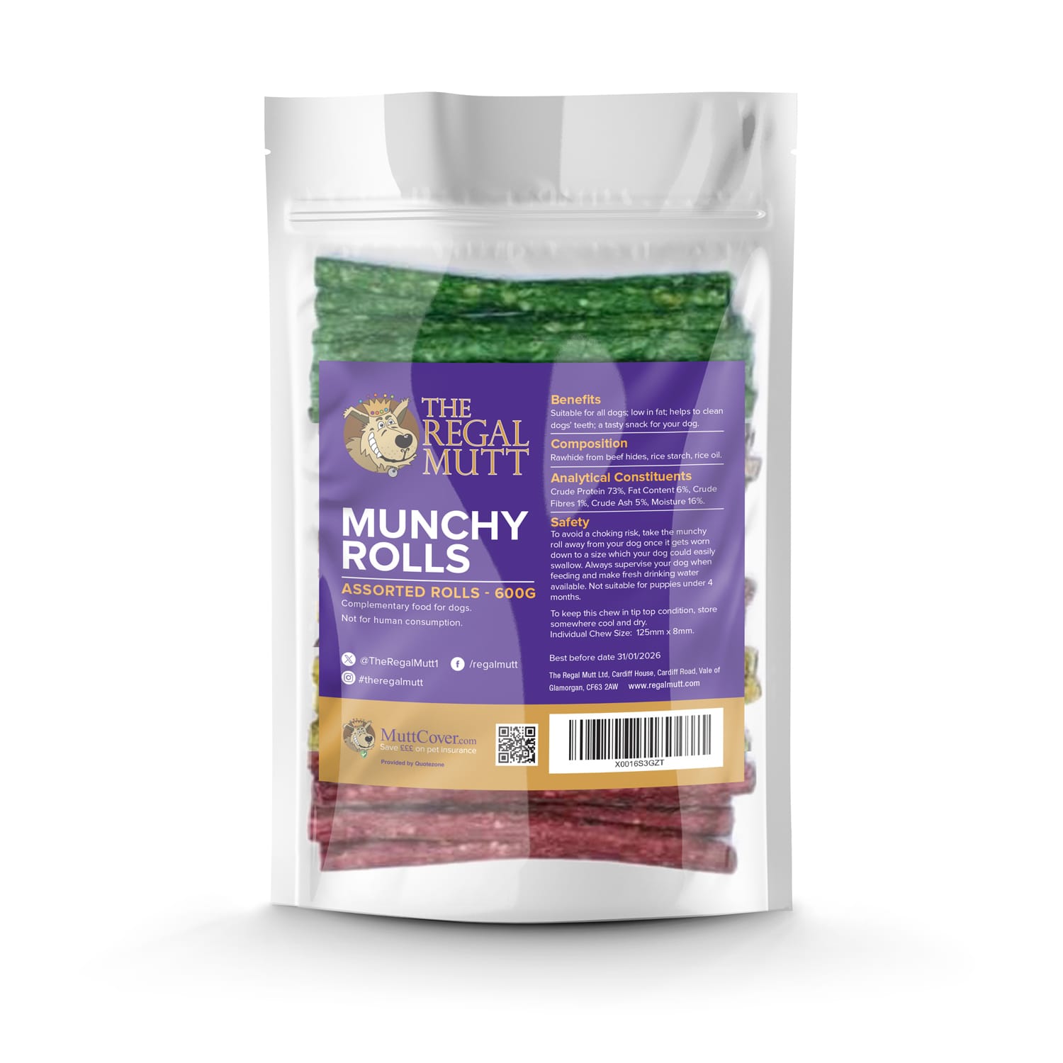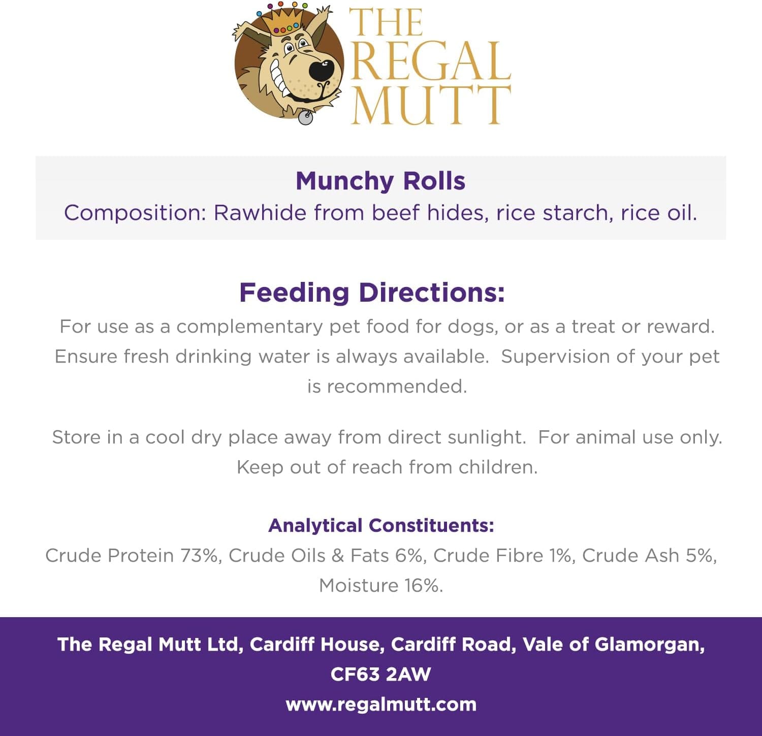 Pack Contents: 1 x bag of 600g of Munchy Rolls (approximately 100 per pack); the dimensions of each chew are 125mm x 8mm.